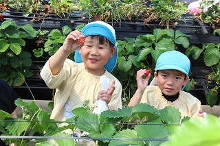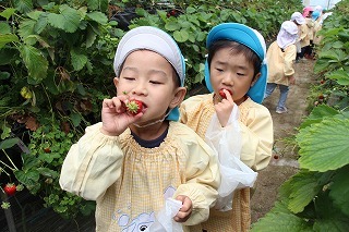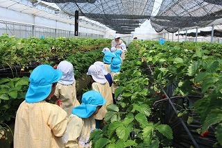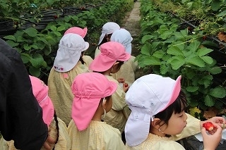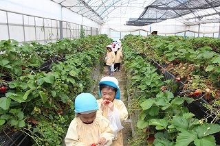 ゆり組さんたちは園バスに乗って、イチゴ狩りに行きました。ひろーいハウスの中で、たくさんの甘いイチゴを摘みながら頂くことが出来ました。みんな大満足で帰ってきました♪