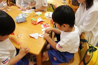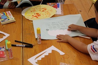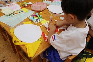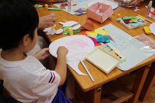 とっても良いお天気、園では保育参観が行われ、親子でうちわ製作です♪見本を見ながら、ハサミやのりを使って、オリジナルのうちわを作りました。みんな頑張りましたね^^