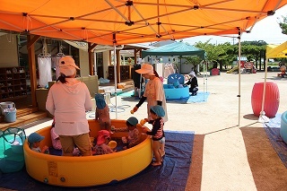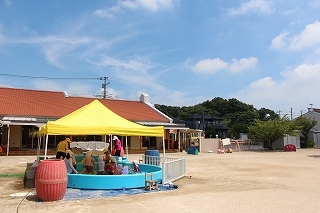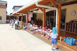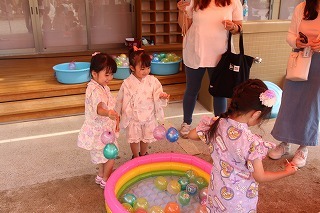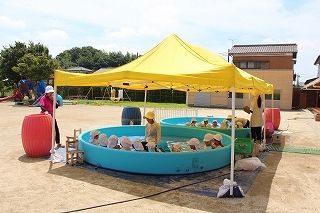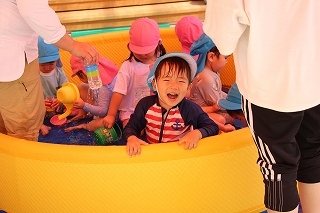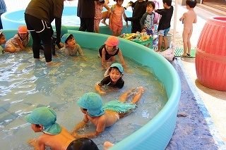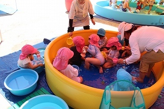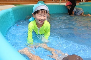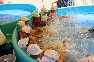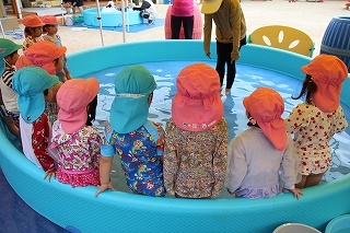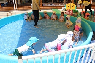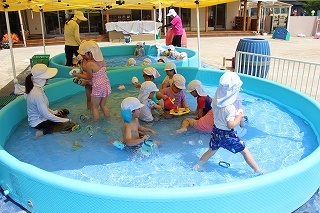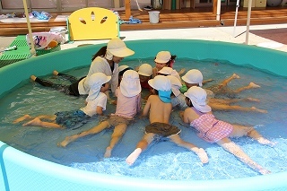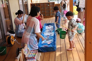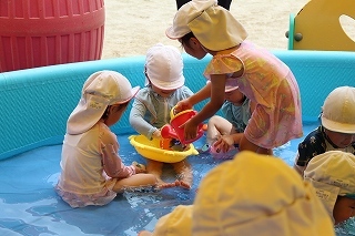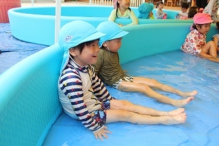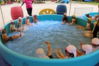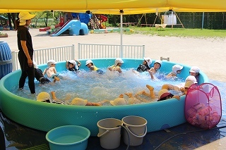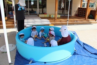プール遊び(沐浴)を楽しみました♪楽しい声が聞こえてきます。小さいお友達は静かにおもちゃを使って水遊びを楽しんでいました。まだまだ暑い日が続きます。お休みの日にプールをされるご家庭もおありと思います。安全に楽しんでくださいね♪