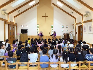 5月12日(日)の母の日、さくら組さんたちは、水郷めぐみ教会での「母の日音楽礼拝」で子ども聖歌隊として元気いっぱいお歌を歌うことが出来ました♪「おかあさん」の歌も、とても感動的でした。その後、音楽ゲストのPaul M.さんとZionさんご夫妻の素敵な賛美と音色に触れるひと時を過ごしました。保護者の皆様のご協力を心からありがとうございます!