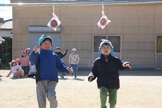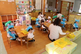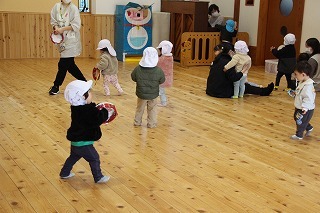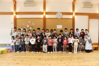 以上児のみんなはホールに集まって、1月のお誕生会が行われました。未満児のみんなは、それぞれのクラスにて♪