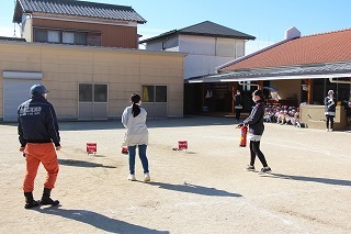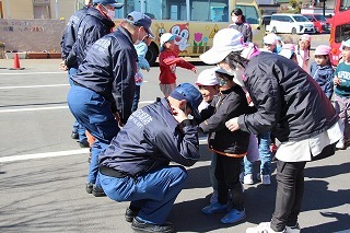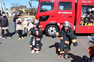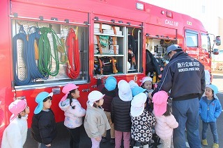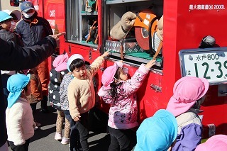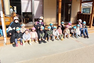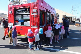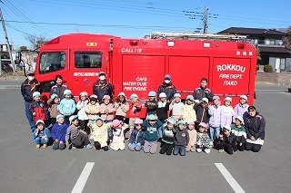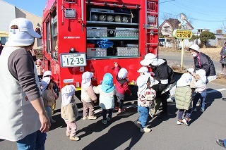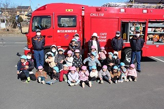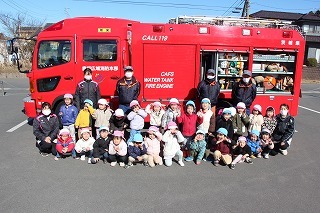 毎月行っている避難訓練がありました。2月は、消防士さんたちが消防車に乗って来園です。避難訓練を現場を見て頂き、大切なお話も伺いました。消防車を見せて頂き、みんな大興奮!みんなで一緒に記念写真も♪