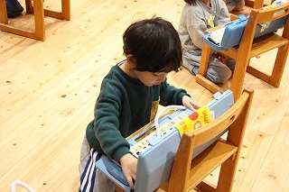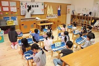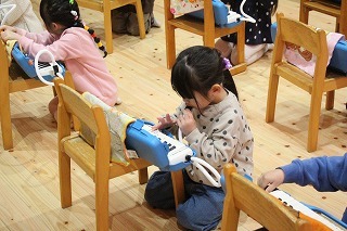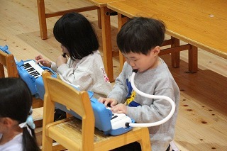 ばら組さんは、新学期からメロディオンがスタートしています。先生のお話に耳を傾けながら、口で吹いて指を動かしながら、楽しみにながらチャレンジしています♪