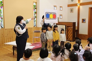 今年も、交通安全教室が行われました。昨年末に行われました「世代間交流型交通安全教室」で聞いたお話も覚えていて、あらためて大切なお話をして頂きました。年長児さんたちは、新年度は小学校がスタート。横断歩道を渡る練習も行いました★