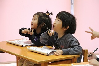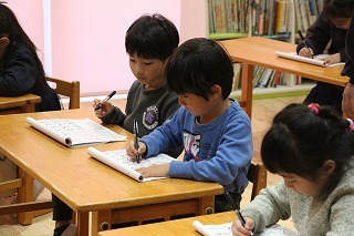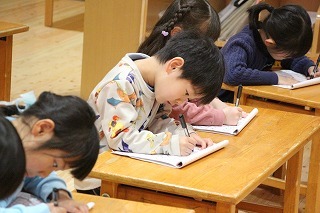 ゆり組さんのペン字教室の風景です。みんな集中して先生のお話を聞きながら、特別な練習帳でお勉強。楽しみながら、ペン字教室を行っています♪