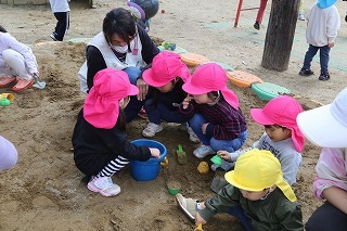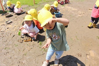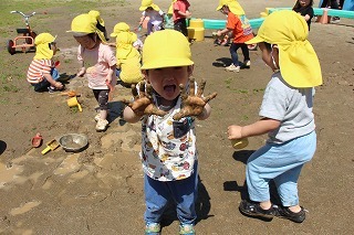 たんぽぽ組さんは、園庭で思いっきり泥あそびを満喫しました♪手で泥の感触を味わって「きもちい~!」という声も聞こえてきました。大はしゃぎのお子さん、一所懸命に泥をシャベルで集めたり、手でコネコネしたり、思い思いの楽しみ方で遊んでいました。洗い物のご協力、よろしくお願いいたします!