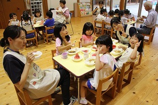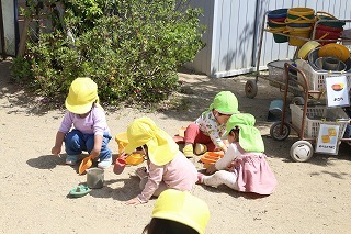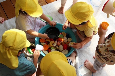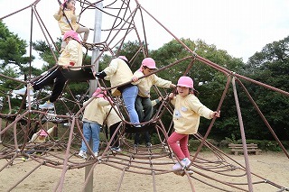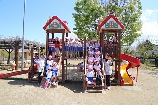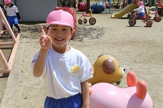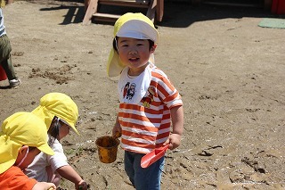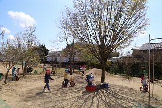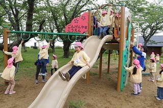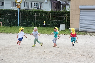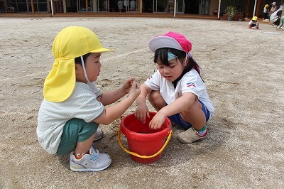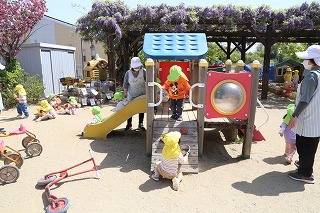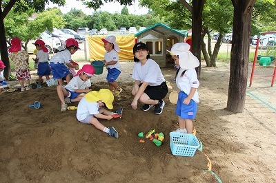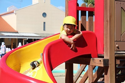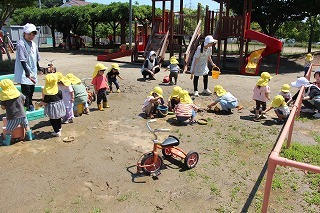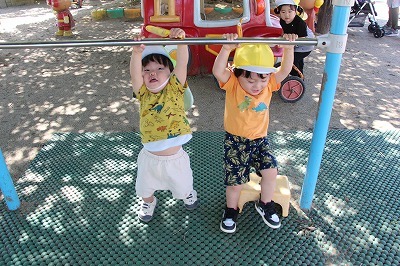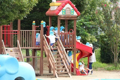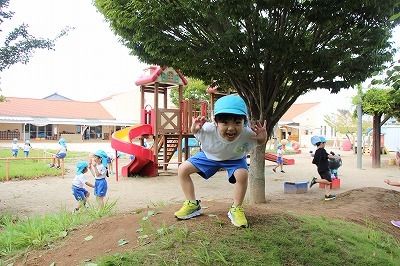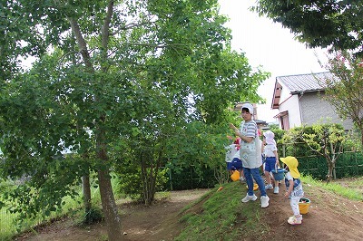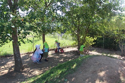 猛暑日が続く中でも、涼しい日には園庭でのびのびと遊んでいます。青々と茂った築山周辺の木々にはそれぞれ実もなって「僕にもとって~私にも取って~」と声が聞こえてきます。園庭で走り回ったり、お山で土遊び、大型遊具で楽しく遊んだり、笑顔がいっぱいです♪