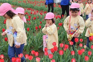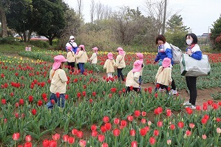 年長児は、新しいアンパンマンバスに乗って、チューリップ見学に行ってきました。色とりどりのチューリップがお出迎え。たくさんの鮮やかなチューリップの色を見ながら、公園をお散歩しました♪天候も守られ感謝!