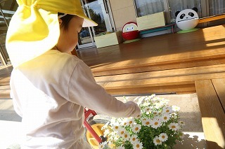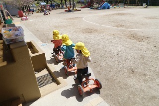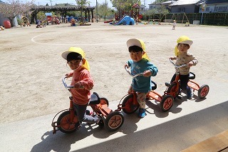 とーってもお天気の良い一日、広い園庭でのびのびと思い思いの遊びを楽しんでいます。たんぽぽ組さんも上手に三輪車に乗っています。季節のお花もとってもきれいです♪