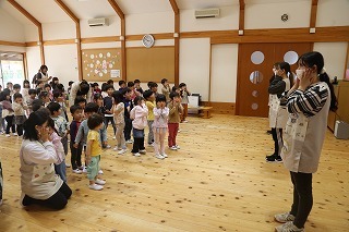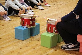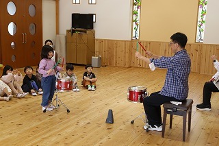 今年度のマーチング講習がスタートです♪講師の先生にご指導いただき、リズムに乗って体を動かしたり、発声練習をしたり、楽しく過ごしながら、刺激ある学びの時です。さくら組さんは、実際に小太鼓を叩いてみましたよ♪
