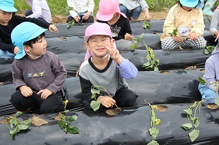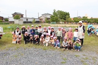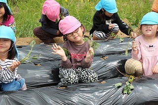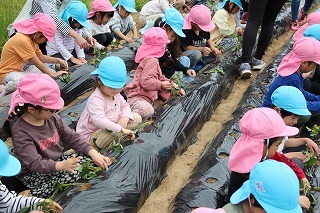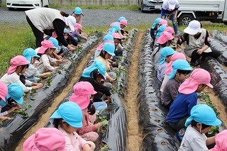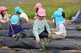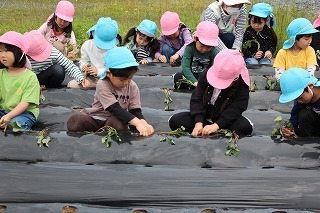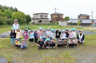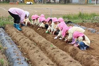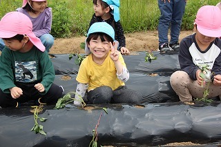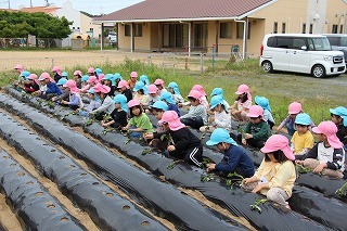 さくら組・ゆり組さんは、こひつじ園の畑で、さつまいも苗植え体験を行いました。秋は、ばら組さんも一緒に、さつまいも掘りを行う予定です!楽しみに~♪