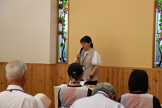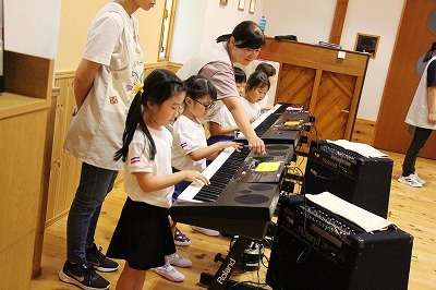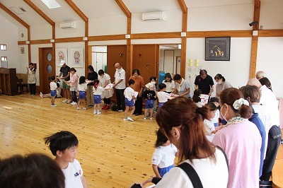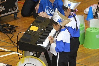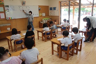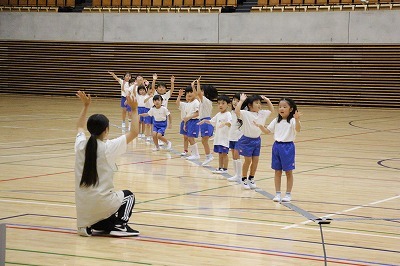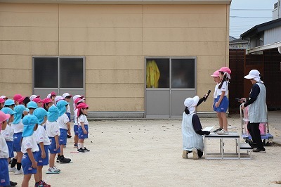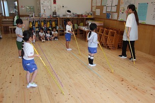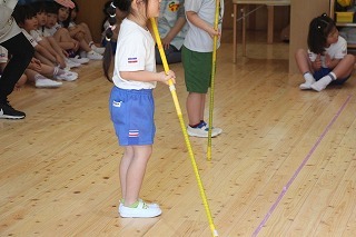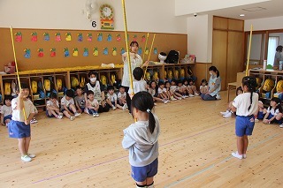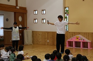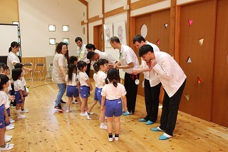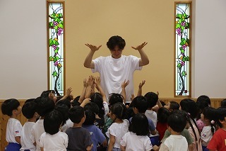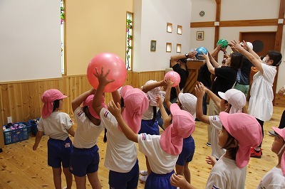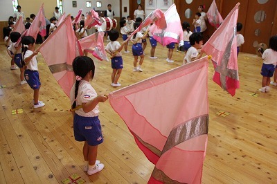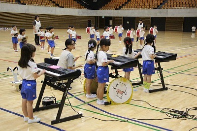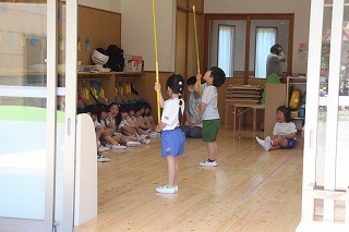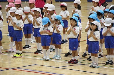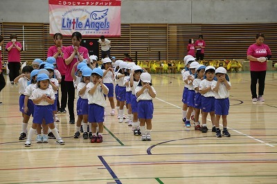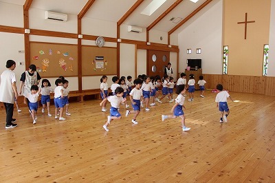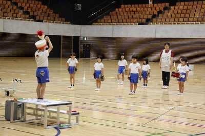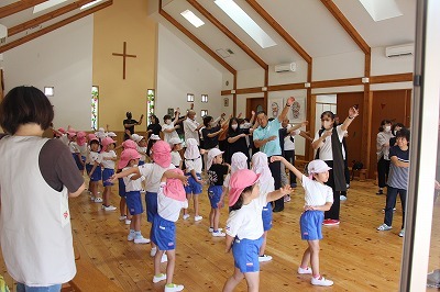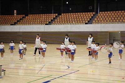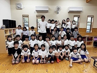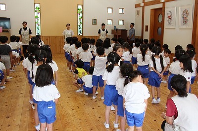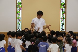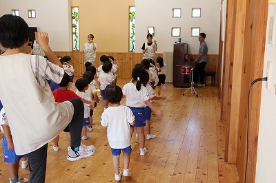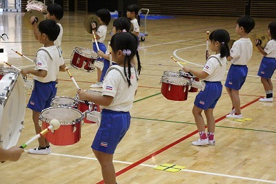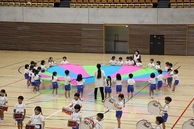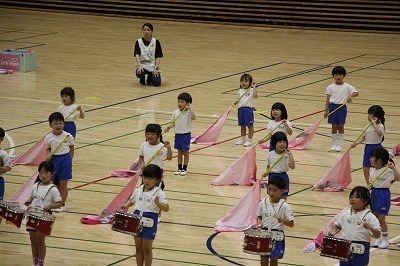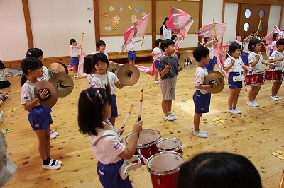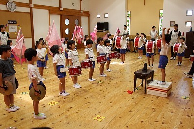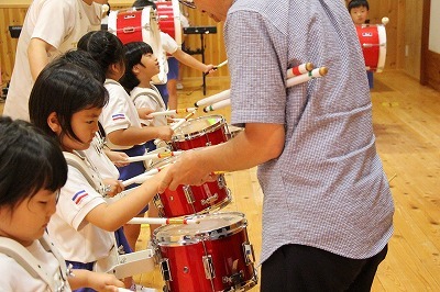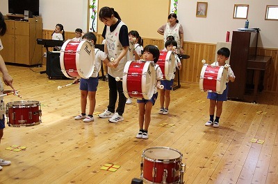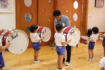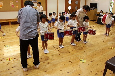 8月最後の日、講師をお招きしてマーチング講習が行われました。まずは、以上児3クラスで体を動かし、発声をしながら、先生と楽しくひと時過ごしました。その後、リトル★エンジェルスの2クラスは、先生と一緒にマーチングに取り組むことができました。