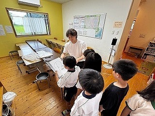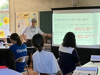 7月30日に幼児教育と小学校教育のより良い接続を目指して津知小学校、延方小学校、こひつじ園の合同研修会がありました。午前中は保育参観を通して子どもたちが遊びながら学ぶ姿を小学校の先生方に見ていただきました。午後は学校にて、教員・保育教諭が一緒に語り合い、子どもが遊びながら主体的に学んできたことを、どのように小学校へ接続していくかを大学の先生を通して研修することが出来ました。