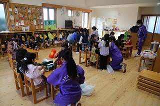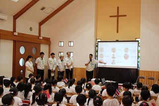 プロジェクターで各国の食べ物や有名なもの、写真や音楽を見聞きし、またそれぞれの国のジャンケンの発音を教えてもらいながら、楽しく交流の時を過ごすことが出来ました。最後は、一人ひとりハイタッチ!子どもたちにとって良き経験となり心から感謝しています^^