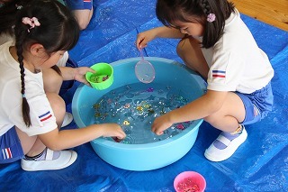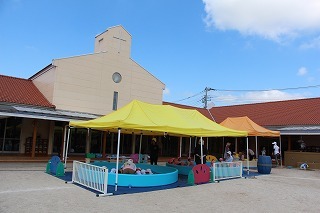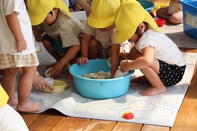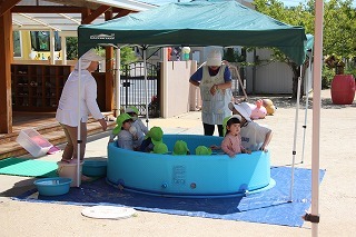 みんな楽しみにしていたプール遊びが、スタートしました♪毎日、とても暑いお天気なので、テントの下のプールで楽しく遊んでいます。もちろん怪我事故防止のために、各プールにそれぞれ職員が監視でついています。十分に安全に留意しながら、楽しい時間を過ごしたいと思っています!
