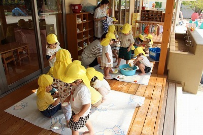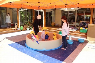 毎日、気温が高くなり、熱中症が起こりやすい日が続いている中なので、たんぽぽ組さんはテラスで水遊びを楽しみましたよ♪
