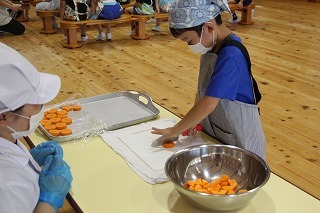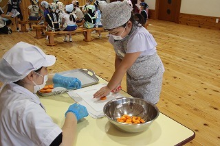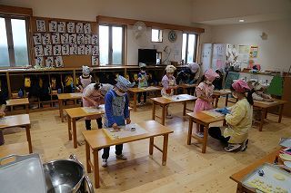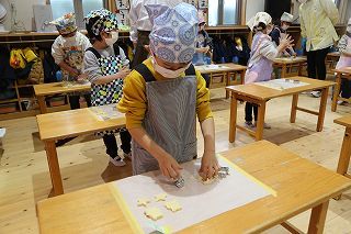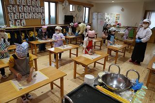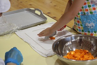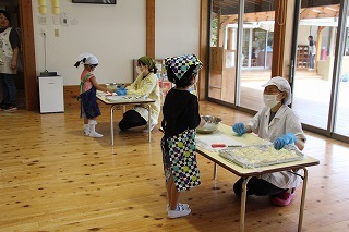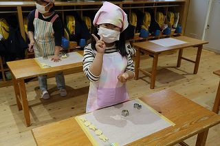 年長組さんは、栄養士の指導のもとで毎年恒例の「クッキー作り」を行いました。出来上がったクッキーは、サックサク。とっても美味しいクッキーができあがりました!