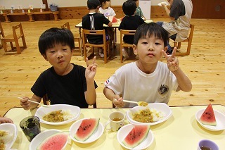 年長児のワクワクワンデーが行われました。みんなとっても楽しみにしていたイベント。ミニこひつじ祭りや製作、カレー作り等々。夕方はみんなでカレーを頂き(悪天候のため室内で)、少し花火も見て楽しむことが出来ました!
