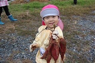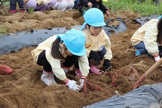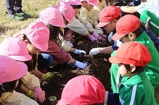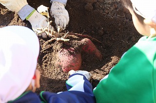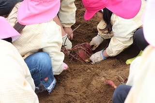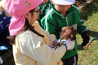 年長児さんは、津知小学校1年生のみんなと一緒に、サツマイモ掘りを行いました♪一緒にいも苗植えをしたお芋が大きくなって、協力して大きなお芋を掘りました。お土産もありがとうございました♪