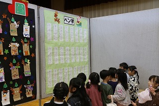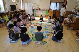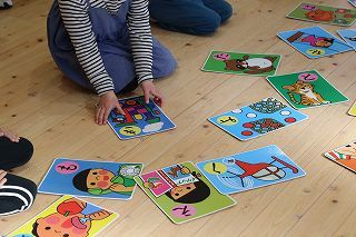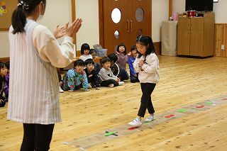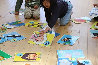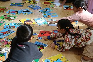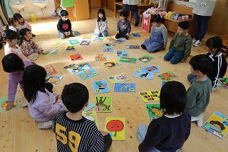 年少~年長組は、かるたとり大会を行いました♪大きなかるたが並べられ、先生の読む言葉を聞きながら、覚えた字を見つけては「はい!」と言って手を伸ばしていました。みんな楽しくがんばりましたよ!