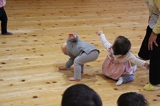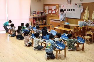 リトミック講師の先生のピアノの音色に合わせて、各クラス楽しいひと時を過ごしました♪ひよこ組さん、つくし組さんも、リズムに乗って体を動かしたり、楽器をもって楽しんでいました♪