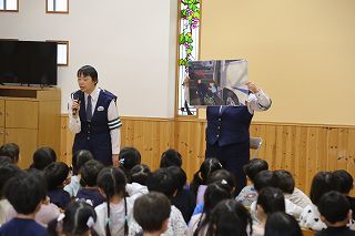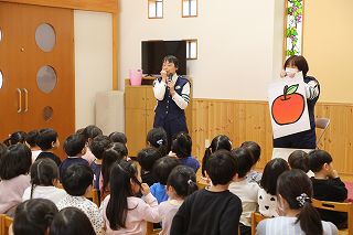今年も、交通安全教室が行われました。腹話術のケンちゃんのお話、子どもたちも楽しみながら大切なお話を伺うことが出来ました。年長児は、横断歩道の渡り方も練習しました。ありがとうございました!