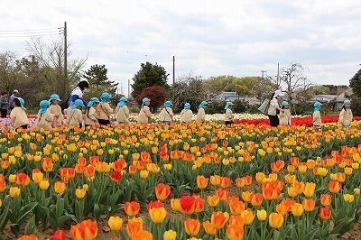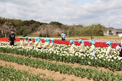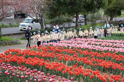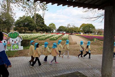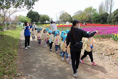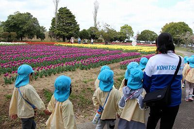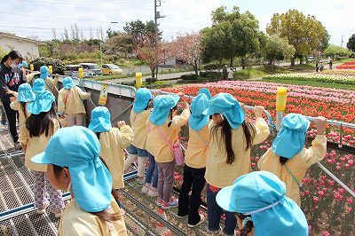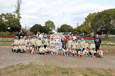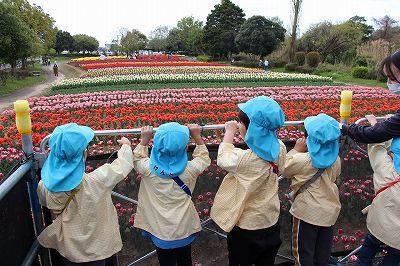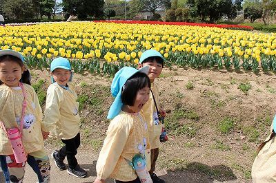 年長児のみんなで「アンパンマンバス」に乗って「和田公園」に行きました。たーくさんの色とりどりのチューリップが咲いていて、とっても綺麗でしたよ!楽しかったね♪
